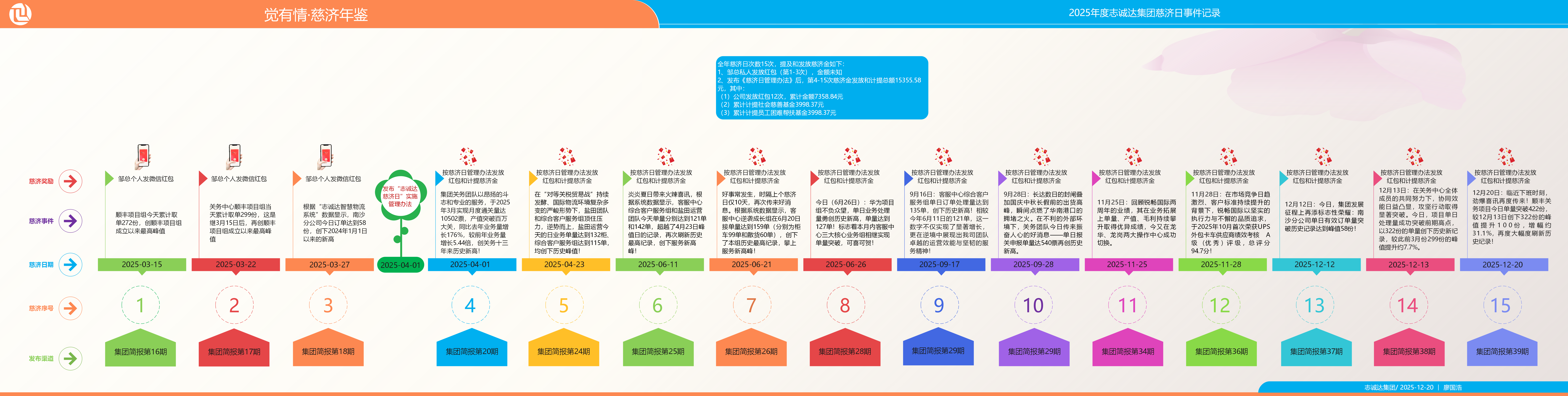 携手国际物流巨头,深耕航空货运,在港前服务领域取得新突破;更获得来自头部企业等颁发的“卓越贡献奖”“最佳服务奖”等18次客户肯定;15个慈济日,我们用行动传递温暖;第二届志诚达奖学金顺利颁发,既是责任,也是力量。十月,“铁规十五条(3.0)”正式落地,制度与安全并行;十二月,公司领导受邀出席华为分享现场,共话智慧物流未来。