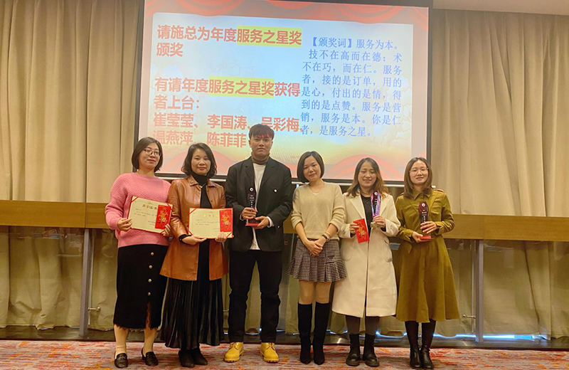 第三由施总为年度服务之星获得者---崔莹莹、李国涛、吴彩梅、温燕萍、陈菲菲颁奖。公司为他们制作了精美的奖杯和红包!服务为本,技不在高而在德;术不在巧,而在仁。服务者,接的是订单,用的是心,付出的是情,得到的是点赞。服务是营销,服务是本。你是仁者,是服务之星。