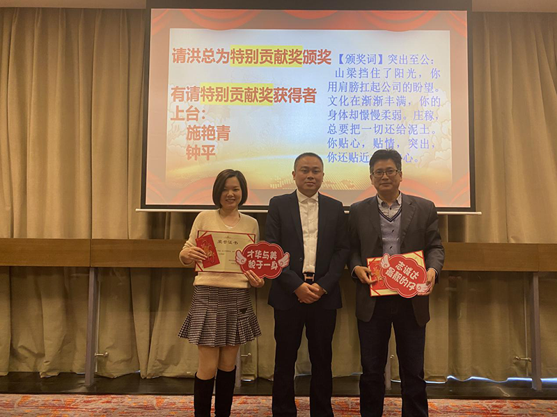 第二由洪总为特别贡献奖获得者---施艳青、钟平颁奖,表彰他们在申报中国物流与采购联合会获评的"中国4A级物流企业"资质申请过程中的优异表现,为公司赢得的金字招牌,充实了更具权威的资质作出特别贡献。