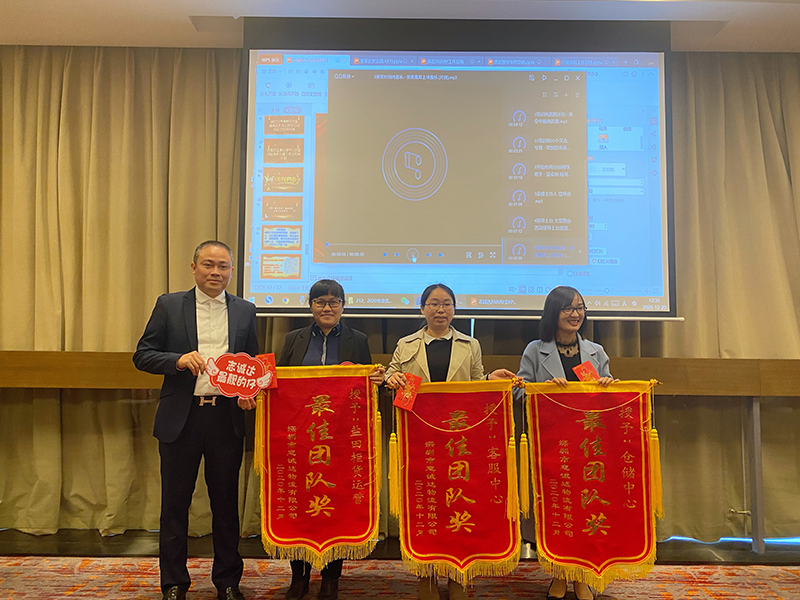 第一由洪总为年度最佳团队获得者---仓储中心、客服中心、盐田柜货运营颁奖,分别由刘金艳、丘宇玉、柯惠怡代表所在部门上台领取锦旗及红包奖励。在今年工作中他们用勤力的手,在人间写下大爱。不强的身躯,高贵的心灵,你们在合中俯视生命。一次次协作,是寄给公司的祝福,所有人都因此而思考协作。