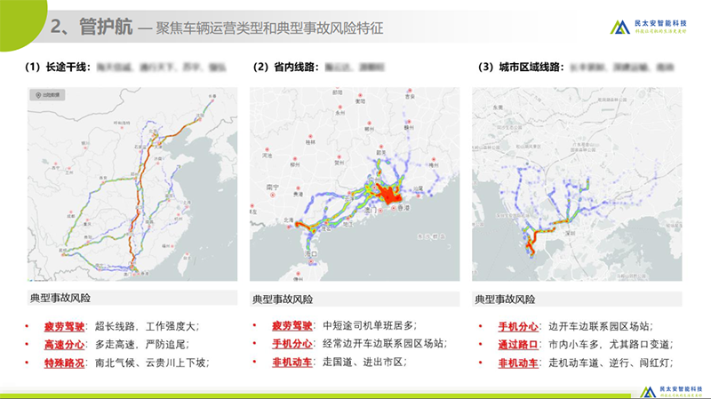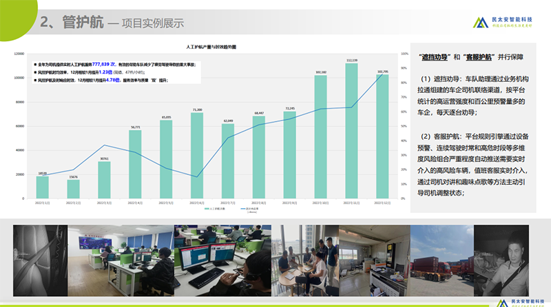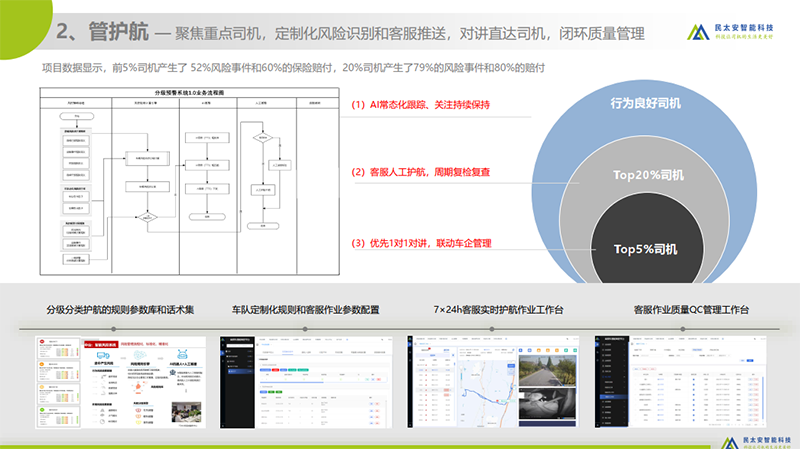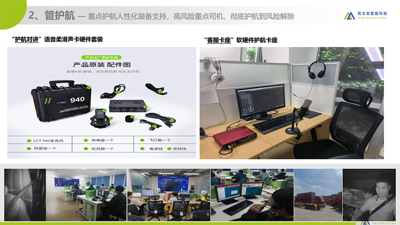 体系,通过“1看4管”风控服务体系(看指标、管设备、管护航、管培训、管事故),穿透触达到驾驶员,定制化风险识别和客服推送,对讲直达司机,闭环质量管理,为物流企业和驾驶员在途提供有温度的全程护航。平台规则引擎通过设备预警、连续驾驶时常和高危时段等多维度风险组合严重程度自动推送需要实时介入的高风险车辆,7×24小时值班客服实时主动介入,通过司机对讲和趣味点歌等方法主动引导司机调整状态,彻底护航到风险解除。