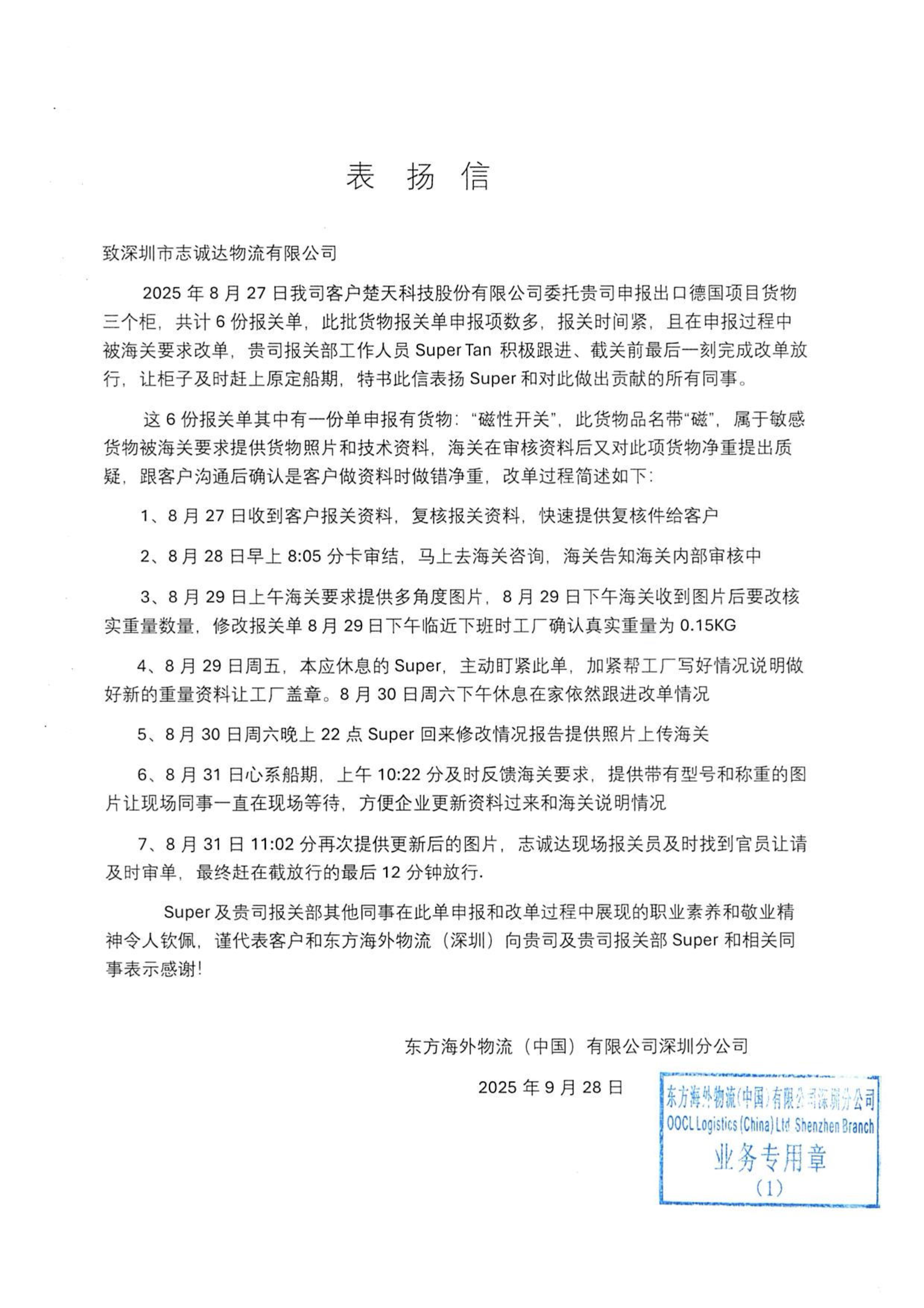 2025年10日09日来自客户东方海外表扬信